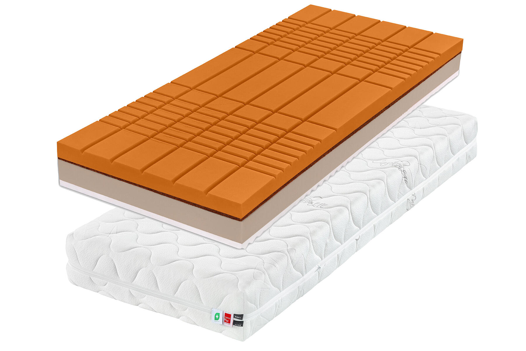 Die 2 cm hohe Verteilungsplatte aus gepressten Kokosfasern verleiht der Matratze Härte und Widerstandsfähigkeit. Die empfohlene Belastbarkeit dieser Seite ist 150 kg.